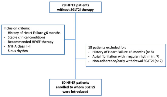 Out of 78 patients, 18 were excluded, nine because they had a recent history of HFrEF, seven because of atrial fibrillation with irregular rhythm, and two because of non-adherence and early withdrawal of SGLT2i therapy (Figure 2). The clinical characteristics of the remaining patients are shown in Table 1. Among these, due to the timing of the National Health System rules on the reimbursement of SGLT2i, dapagliflozin was prescribed in most of the patients (number: 55).