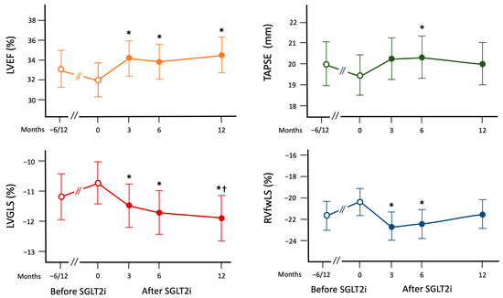 Changes in the parameters reflecting left and right ventricular functions after the onset of type 2 of sodium-glucose cotransporter inhibitors. The data are expressed as mean and 95% confidence interval at linear mixed model for repeated measurements. LVEF: left ventricular ejection fraction; LV-GLS: left ventricular global longitudinal strain; RV-fwLS: right ventricular free wall longitudinal strain; RV-GLS: right ventricular global longitudinal strain. p refers to linear mixed model. * p < 0.05 vs. T0; † p < 0.05 vs. T-6/12.