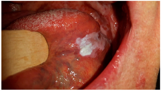 CHC also historically referred to as Candidal leukoplakia or Candidal leukoplakia-erythroleukoplakia, is a persistent oral mucosal condition characterized by the presence of white or cream-colored patches on the inner lining of the mouth [8,9]. These patches commonly appear on the tongue, cheek lining (buccal mucosa), and the floor of the mouth. Figure 1 shows CHC, which is located mostly on the tongue due to its surface characteristics with numerous papillae that trap debris and microorganisms, providing an environment for Candida biofilms to form. The tongue’s moist and warm environment, along with its fissures and crevices, further supports Candida overgrowth and persistence. Additionally, the reduced self-cleansing ability of the tongue’s dorsal surface and its specifics of keratinization pattern make it particularly susceptible to Candida colonization and the development of CHC lesions. While CHC can also occur in other areas of the oral mucosa, the tongue’s unique features make it a primary site for this chronic disorder. Figure 1 and Figure 2 were taken during a clinical examination at University Hospital in Pilsen for this research.