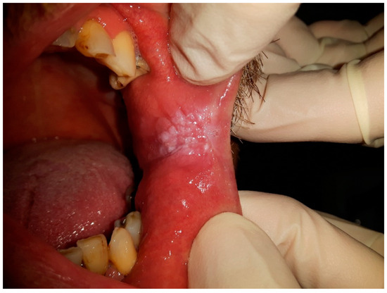 Chronic hyperplastic candidosis (CHC) is a chronic disorder of the oral mucosa [1,2,3]. Chronic oral lesions with a higher incidence include oral potentially malignant disorders (OPMDs), ulcerations of different etiology, chronic candidiasis, and the manifestation of autoimmune bullous diseases [4,5,6]. The WHO classifies OPMD conditions as those with a proven higher statistical association with oral mucosa carcinoma development compared to healthy mucosa [7,8]. Disorders are clinically mostly white, unscratchable patches and leukoplakias. Visually, these are divided into homogenous and nonhomogeneous disorders, where the second variant usually has more epithelial dysplastic changes and a worse prognosis. Nonhomogeneity is determined by hyperplasticity and the color spectrum of white–red patches [9]. Then, it is differentiated into leukoerytroplakia and erythroplakia. Disorder presence in a group of OPMDs is dynamically based on the level of actual information about its malignant transformation risk to oral carcinoma. CHC has been classified as an OPMD since the year 2017. In the fifth edition of the WHO OPMD classification, CHC was excluded due to a lack of sufficient studies proving its premalignant potential. CHC is a rare form of oral candidiasis, which has acute and chronic pseudomembranous or acute and chronic atrophic variants [10]. CHC is also clinically a white or white–red patch on the oral mucosa, so it mimics leukoplakia or erytroleukoplakia. The lesions are mostly nonhomogeneous, tough when palpitated, and can develop into a nodular form. The speckled patch of CHC is more specific, mimicking leukoerythroplakia with hyperkeratosis and atrophy [11].