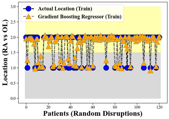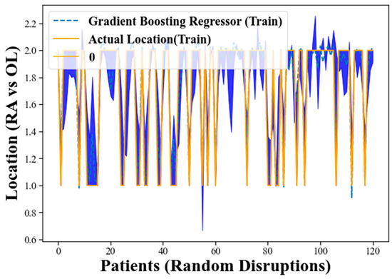 Figure 3 illustrates the performance of the GBR model during the training process, using the input data and corresponding target labels. The orange triangular points, intersected by the grey dotted line, represent the GBR model’s response during the training phase. Conversely, the blue circles, intersected by the solid line, depict the actual location of the CHC. As evident from the figure, the GBR model’s predicted locations align remarkably well with the actual occurrences of CHC, which validates the robustness of our proposed method. The clear separation between these two bands indicates the GBR model’s proficiency in distinguishing CHC locations based on the provided input features. This spatial separation provides a solid foundation for the accurate classification of CHC instances between RA and OL, contributing to the model’s overall suitability for addressing this specific classification problem.