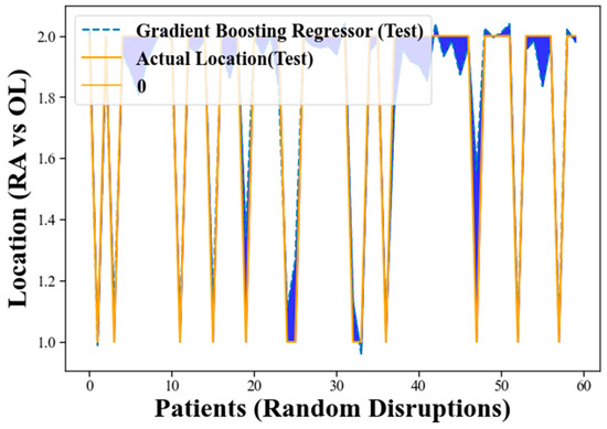 Furthermore, the R2 coefficient for the GBR model was relatively high, implying that the model explained a significant proportion of the variance in the target variable, i.e., the CHC locations. This indicates that the GBR model’s predictions were well-fitted to the actual data, and it had a good ability to capture the underlying patterns and relationships in the dataset. The results presented in Figure 7 affirm the satisfactory performance of the GBR in comparison to the other evaluated machine learning methods. The GBR model’s ability to handle complex relationships and its robustness in predicting the target variable makes it a suitable and promising choice for the task of classifying CHC locations in medical signal processing. However, it is important to note that the choice of the best model may also depend on other factors, such as interpretability and computational efficiency, which should be considered in practical applications.