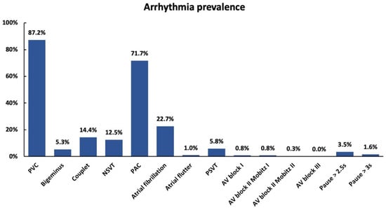 Considering frequencies of arrhythmias in our study, PVCs and PACs emerged as the most common arrhythmia patterns in the HECG examinations. This finding aligns with several previous investigations [,,]. The results of the cardiovascular health study by Maniolo et al., investigating arrhythmia in 24 h ambulatory ECG of older adults, revealed that both ventricular and supraventricular ectopic activity are extremely common in older people, with only 18% and 2.8%, respectively, showing no such occurrences []. In a separate study focusing on PACs in Japanese men, it was shown that 99% of participants had at least one PAC during 1 h. The authors found a significant increase in the number of PACs with age, with the median number of PACs per hour rising from 1.04 in patients aged 40–59 to 4.19 in those aged 70–79 years old []. Conen et al. investigated PACs in the general population and reached similar conclusions on PAC frequency and age distribution [].