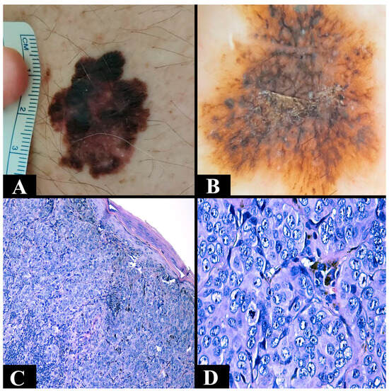 The most common type is superficial spreading melanoma (Figure 1A,B). It particularly impacts the Caucasian population [75]. The average age of diagnosis is 51 years. It can be located at any level (trunk or extremities) except the palms and soles [66,67]. It can develop de novo or based on a pigmented nevus [66]. During its initial stage, the growth of the lesion is slow and progresses radially. It appears as a brown-to-black macule, measuring less than 5 mm, with irregular edges. The lesion is confined to the epidermis or may extend focally into the papillary dermis. During the vertical growth phase, the rapid development of a nodule or a papule occurs, which may potentially ulcerate [66,75]. Histopathologically, a stage of melanoma in situ is evident, showing a pagetoid extension of malignant melanocytes along the epidermis. The initial invasive stage involves the spread of malignant cells in the superficial dermis [76]. The specific architecture consists of asymmetry, nests of melanocytes of various sizes and shapes, with the absence of maturation in the dermis. It is also associated with different degrees of solar elastosis [77].