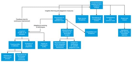 To comprehend the long-term ramifications of AI utilization in academic work, it is imperative to undertake extended studies that track changes over an extended period. These investigations could delve into shifts in attitudes toward AI, the evolution of AI-related plagiarism, and its impact on the caliber and authenticity of scholarly endeavors. They may also shed light on how the integration of AI into academic literature influences the reliability of scholarly publications, the peer-review process, and the broader academic community (Figure 2).