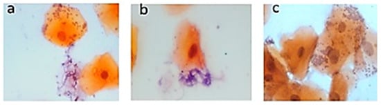 Exfoliative cytology of the samples from patients with T2DM confirmed the presence of Candida. Figure 1 shows the hyphae of the Candida types. Tangled tubular hyphae were observed related to desquamated epithelial cells (Figure 1a,b), and Candida was observed in the form of yeast and has an appearance of round or ovoid cells, which form small groups (Figure 1c).