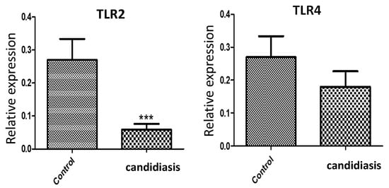 In addition, qPCR analysis revealed a significant decrease (p < 0.0001) in the mRNA expression of TLR2 in the candidiasis group relative to that in the control group (Figure 2). In contrast, there was no significant difference in TLR4 expression between the groups.