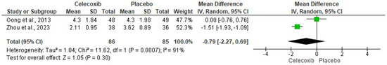 The quantitative evaluation showed that celecoxib presented a statistically significant decrease in postoperative rescue analgesic consumption compared to a placebo after this type of surgery. It is important to note that the heterogeneity of this meta-analysis was high, and to be conservative in our statistical analysis, the random effects model was used. The decreased consumption of rescue analgesics in the postoperative period is an important finding that has been observed in many surgical areas [38,39,40,41,42,43,44,45].