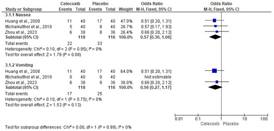 The assessment of pain intensity with the VAS at rest was performed using data from two clinical trials [24,29]. Analysis of the data showed no statistical differences between celecoxib and the placebo (n = 171, I2 = 91%, p = 0.3, mean difference = −0.79, 95% IC = −2.27 to 0.69; Figure 3). On the other hand, the evaluation of the intake of rescue analgesics was carried out with four clinical trials [25,26,27,29]. The statistical evaluation showed that the patients receiving celecoxib had a lower rescue analgesic intake compared to patients receiving a placebo (n = 278, I2 = 82%, p = 0.006, mean difference = −6.89, 95% IC = −11.76 to −2.02; Figure 4). Finally, the adverse reactions were evaluated using information from three clinical trials (n = 234) [25,26,29]. Both nausea (n = 234, I2 = 0%, p = 0.08, OR = 0.57, 95% IC = 0.3 to 1.06; Figure 5) and vomiting (n = 234, I2 = 0%, p = 0.13, OR = 0.56, 95% IC = 0.27 to 1.17; Figure 5) were similar between celecoxib and a placebo.