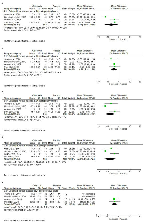Sensitivity analysis shows how the statistical difference is preserved even when data from different studies are excluded. Excluded study: (a) = Huang et al., 2008; (b) = Ittichaikulthol et al., 2010; (c) = Meunier et al., 2009; (d) = Zhou et al., 2023; and (e) = Huang et al., 2008 and Ittichaikulthol et al., 2010 [25,26,27,29].