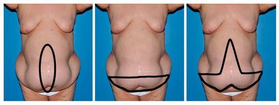 Schematic representations of the different types of panniculectomy. (left) Vertical, (center) horizontal, and (right) fleur-de-lis. This figure is taken from Giordano et al. [6].