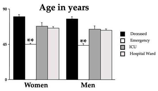 Mean age in years of the recruited individuals for each group divided by sex. The error bars indicate pooled standard error means (SEMs) derived from the appropriate error mean square in the ANOVA. The asterisks (** p < 0.01) indicate the post hoc differences between the emergency group and all the other groups.