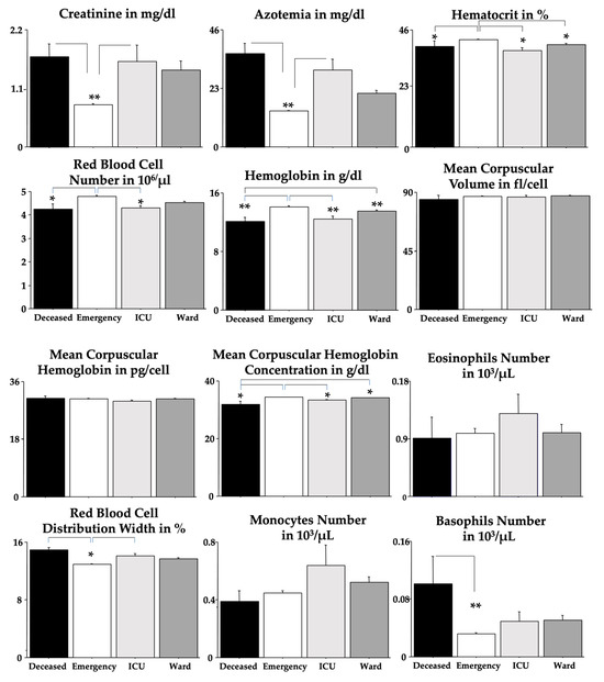 Each blood parameter was analyzed by using an ANOVA test for each group (Table 3). Figure 3 shows these findings but without the sex effect. We found significant elevations due to severe outcomes in creatinine, azotemia, RDW and basophils but significant diminutions in RBC, Hb, Hct and MCHC when compared to the emergency group. Post hoc comparisons are shown in the figures as asterisks and lines.