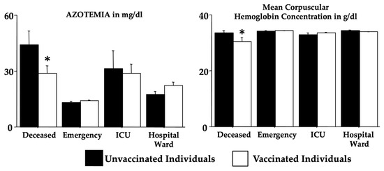 Vaccination effects on azotemia and mean corpuscular hemoglobin concentration (see Table 8). The error bars indicate pooled standard error means (SEMs) derived from the appropriate error mean square in the ANOVA. The asterisk (* p < 0.05) indicates post hoc differences between vaccinated and unvaccinated individuals in the deceased group.