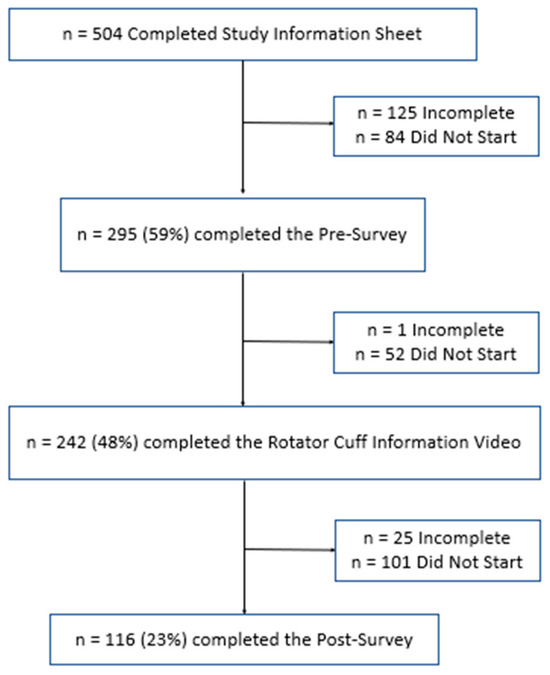A total of 504 participants completed the study information sheet, acknowledging that they were over the age of 18 and were participating voluntarily. Of these, 84 (16.7%) did not start the presurvey, 125 (24.8%) partially completed the presurvey, and 295 (58.5%) fully completed the presurvey. Next, participants were asked to watch an educational video about RCTs. Of the participants that completed the presurvey, 242 (48.0%) participants completed the educational intervention. Finally, participants were asked to complete the survey again to assess their new level of understanding. Of the participants who completed the rotator cuff video, 25 (5.0%) partially completed the postsurvey, and 116 (23.0%) fully completed both surveys. This is summarized below in Figure 1.