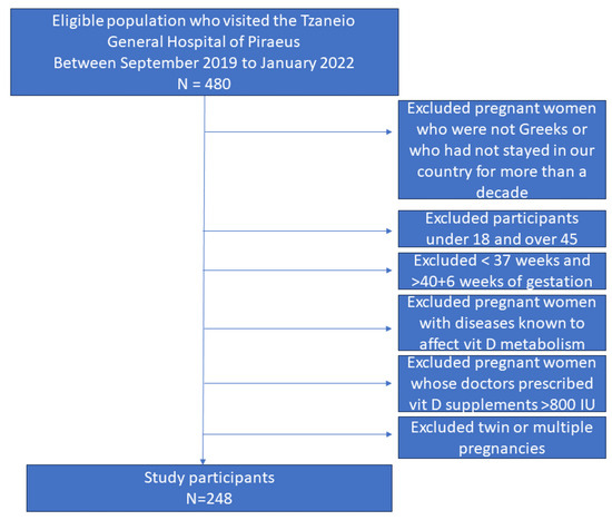 We conducted a cross-sectional study that enrolled a sample of 248 healthy, pregnant Greek women (>18 years old) giving birth at Tzaneio General Hospital of Piraeus. Piraeus is a port city in the region of Attica at latitude 37 56′ 50.82″ Ν. and, on average, receives around 3920 h of sunshine throughout the year [19]. Piraeus experiences the highest level of UV radiation in May, July, and August, when the maximum UV index can reach values of 10–10, which corresponds to the Very High category of sun exposure [19]. January, February, and December are in the Moderate exposure category. In these months, the maximum values of the UV index do not exceed 4 [19]. A total of 248 mother–infant pairs took part in our investigation, from September 2019 to January 2022. From our total sample of 248 pregnant patients, 221 (89.1%) of our sample are native Greeks and only 27 (10.9%) are Europeans who have been living permanently in Greece for more than a decade. This study involved all pregnant Greek women (or Europeans living in Greece for more than 10 years) who were cared for by doctors from our clinic throughout their pregnancy and gave birth at the Obstetrics and Gynecology clinic of the Tzaneio General Hospital of Piraeus. Their doctors recommended or not prenatal Vit D intake. Excluded from our study were pregnant women whose doctors we knew in advance would prescribe prenatal Vit D supplements > 800 IU (Figure 1). Pregnant women taking medications known to affect Vit D metabolism and Vit D supplementation, such as corticosteroids, antiepileptics, antituberculosis drugs, and antifungals, were also excluded (Figure 1). Exclusion criteria were also non-European pregnant patients as well as pregnant women who were not willing to participate in this study (Figure 1). Inclusion criteria for our study were all pregnant women giving birth in our clinic and who received or did not receive a regular dose of Vit D (400–800 IU/day) and calcium (500 mg/day) supplementation, according to the direction of their treating physicians. As previously stated, we recorded in advance what was prescribed by the doctors and the content of Vit D preparations in order to determine whether they would be included in our study. Under no circumstances did we modify doctor prescriptions, which were in accordance with the guidelines of the Greek Ministry of Health that states that doctors may administer Vit D supplementation to pregnant women as required [20].