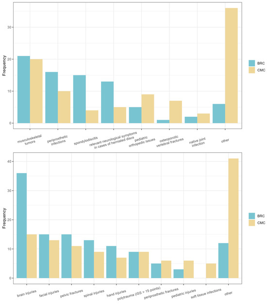 - Roos, J.; Loy, T.; Ploeger, M.M.; Weinhold, L.; Schmid, M.; Mewes, M.; Prangenberg, C.; Gathen, M. It is (not) always on Friday: Inter-hospital patient transfers in orthopedic and trauma surgery. Eur. J. Trauma Emerg. Surg. 2023, 49, 2605–2613. [Google Scholar] [CrossRef]