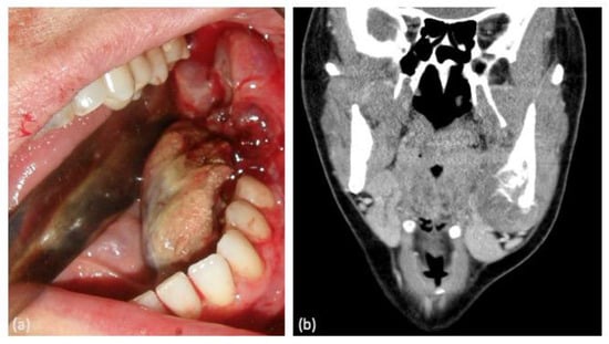 (a) Intraoral clinical manifestation of the tumor in the left mandibular molar area showing bleeding. (b) Computed tomography coronal section image of the same lesion showing an area of osteolysis.
