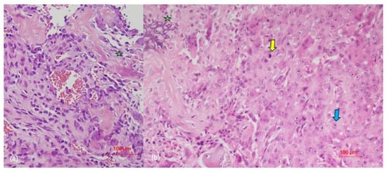 (a) Conventional osteoblastic osteosarcoma (hematoxylin and eosin [HE] ×400): a malignant mesenchymal cell proliferation with cytologic atypia, characterized by variability in cell shape and size, along with anisokaryosis. Nucleoli are evident. The neoplastic cellularity varies in shape from polygonal to fusiform, with focal observation of calcified collagenous matrix production (osteoid). (b) Epithelioid osteosarcoma (HE ×400): hypercellular malignant mesenchymal proliferation, characterized by polygonal tumor cells with abundant cytoplasm and nucleus with open chromatin and prominent nucleolus. The osteoid matrix is associated with neoplastic cellularity. Green star: osteoid formation by malignant tumor cells; yellow arrow: cell mitosis; blue arrow: epithelioid tumor osteoblast.