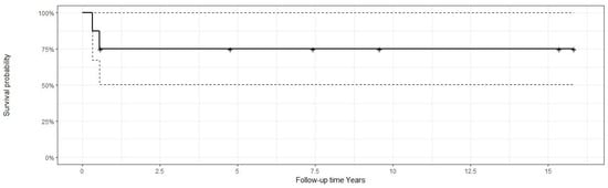 The lower frequency of metastases in OSJs probably influences the survival results [77,78], with 5-year survival rates of approximately 77% for craniofacial OS and 55–70% for conventional OS [58]. These data are highly variable due to the small number of cases in previous studies. In the specific cases of OSJ, the 5-year survival rate ranges from 45% to 74% [29,32,58,72,79,80]. In our study, similar results were observed, since a survival of 75% was observed within the same period. However, the limited number of cases in this study must be taken into account when interpreting the results.