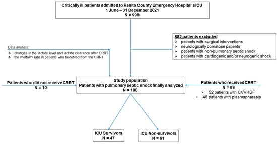 The present study represents an observational study of a cohort of 990 patients who were admitted to the critical care unit of the Resita County Emergency Hospital (Caras-Severin, Romania, latitude 45°17′09.60″ N, longitude 21°53′30.12″ E), from June 2021 to December 2021. The exclusion criteria referred to patients under the age of 18, those who suffered previous surgical interventions, neurologically comatose patients, patients with non-pulmonary septic shock, or those presenting a state of shock of another etiology (cardiogenic and/or neurogenic) (n = 882). Finally, a total of 108 patients remained as the study population to be analyzed, with age > 18 years and admission to ICU with a diagnosis of pulmonary septic shock—these variables refer to the inclusion criteria. During these seven months, of the 108 patients with septic shock enrolled in this study, 69 of them were diagnosed with COVID-19, and 39 patients did not have COVID-19. In addition, from the total number of patients included in this study, 98 patients needed continuous renal replacement therapy (CRRT) (plasmapheresis and continuous venovenous hemofiltration with dialysis (CVVHDF)). Among them, only 28 patients benefited from both renal support procedures, 52 patients benefited from CVVHDF, and 46 patients benefited only from plasmapheresis (Figure 1).