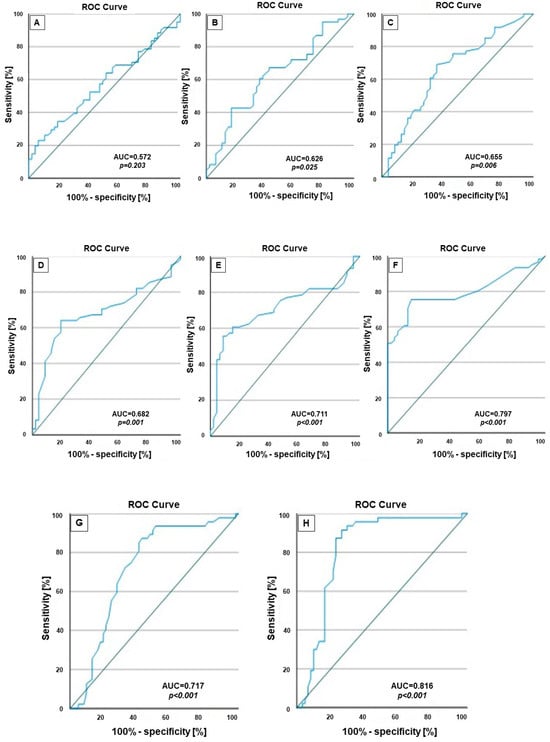 Slightly lower values, but still high, were also obtained at 6 h and 24 h after ICU admission; at 6 h after ICU admission, the ROC curve showed a value of 2.75 mmol/L for lactate level, with a sensitivity of 68.9% and a specificity of 57.4% (AUC = 0.711, p < 0.001, 95% CI: 0.611–0.811), and a value of 2.15 mmol/L at 24 h after ICU admission, with a sensitivity of 77% and a specificity of 53.2% (AUC = 0.797, p < 0.001, 95% CI: 0.712–0.883).
