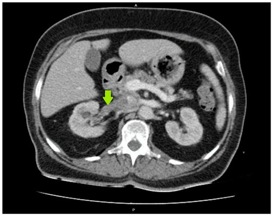 The diagnosis of acute PN was clinically confirmed due to the presence of fever (39 °C) with chills and accompanying dysuria, increased urinary frequency, lower abdominal pain, and right flank pain with a positive Giordano sign, while the laboratory findings indicated increased CRP levels of 116 mg/L (upper normal limit 5 mg/L) and a WBC in urine sediment of >100/hpf (per high power field), and the urine culture yielded a Klebsiella pneumoniae concentration of >10⁵ cfu/mL. As the diagnosis of acute PN was established, the patient received an empirical antimicrobial treatment with piperacillin–tazobactam, and intravenous fluids and insulin were administered as well. Despite this treatment, the patient’s condition did not improve, showing a persistent fever and high inflammatory markers. Therefore, on the fourth day, an abdominal CT scan was performed to rule out the formation of a renal abscess, which revealed right renal pelvis and calyceal dilatation, as well as RVT extending into the inferior vena cava (Figure 1). A chest CT scan and echocardiography did not show any signs of pulmonary embolism, and both CT and magnetic resonance imaging (MRI) of the abdomen excluded the existence of concomitant renal cell carcinoma.