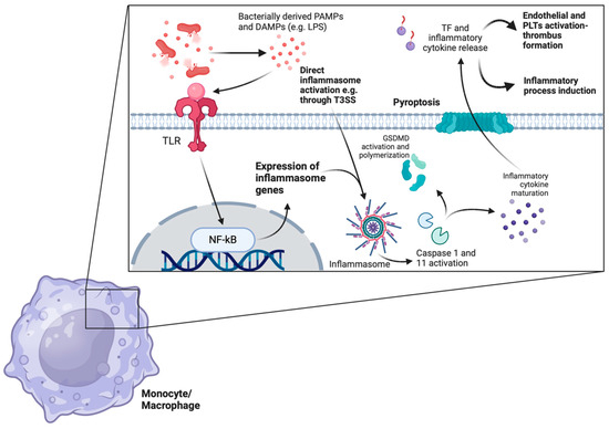 TF is released during sepsis in an inflammasome-dependent way. Bacterially derived DAMPs and PAMPs are recognized by several monocytic or macrophage TLRs. Recognition leads to the downstream expression of several inflammasome-related genes through the activation of the NF-kB pathway. Inflammasome formation cleaves the procaspase-1 peptide to the active caspase-1 protein in the classical inflammasome pathway, which eventually leads to the maturation of several proinflammatory cytokines and GSDMD activation, polymerization, and pyroptosis through membrane pore formation. Of note, LPS directly activates inflammasomes and leads to non-classical caspase-11-induced pyroptosis. Additionally, both LPS itself as well as TLR-mediated monocyte/macrophage priming leads to increased TF expression on plasma membranes. The subsequent release of TF-rich microvesicles into the circulation boosts endothelial and platelet activation, potentiating inflammatory thrombus formation. (TF: tissue factor, DAMPs: danger-associated molecular patterns, PAMPs: pathogen-associated molecular patterns, TLRs: Toll-like receptors, GSDMD: gasdesmin-D, LPS: lipopolysaccharide, T3SS: type III secretion system, PLTs: platelets.) The image was created on biorender.com.