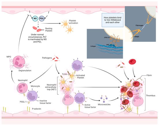 An overview of the thrombo-inflammation process. During inflammation, bacterial products per se as well as pro-inflammatory cytokines, such as TNF-a, activate endothelial cells to express P-selectins. Meanwhile, pathogens in the bloodstream and in tissues induce WBC activation, leading to the increased surface expression of PSGL-1, among others. After binding to endothelial selectins and after contact with pathogens (or pathogen-derived PAPMs/DAMPs), neutrophils experience cellular death through netosis, and NETs bind and activate bystander PLTs acting as scaffolds for thrombus formation. Meanwhile, activated monocytes express increased amounts of membrane-bound TF, which is subsequently released in the form of active TF microvesicles in the circulation after their activation or death (see also Figure 3). Additionally, the degranulation of neutrophils upon activation, especially MPO, degrades the NO excreted from resting endothelium and potentiates PLT activation and thrombus formation. (PSGL-1: P-selectin glycoprotein ligand, DAMPs: danger-associated molecular patterns, PAMPs: pathogen-associated molecular patterns, TLRs: Toll-like receptors, NO: nitric oxide, PGI2: prostaglandin I2, vWF: von Willebrand factor.) The image was created on biorender.com.