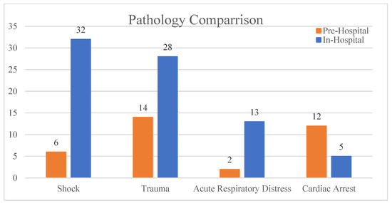A chi-square test for independence was conducted to examine the differences between Study 1 and Study 2 in terms of the number of cases reported, the number of doctors, and the days elapsed, yielding a significant result (p < 0.05) (Figure 3). A comparison of triaged cases from both studies shows a marked increase in the initial presentation of shock and trauma but a decrease in cardiac arrest cases that had POCUS performed compared to the prehospital study (Figure 4).