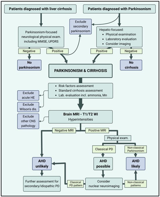 In patients with AHD, the diagnosis of liver cirrhosis usually precedes the diagnosis of Parkinsonism. However, the reverse temporal association has also been described [,,,]. Given the high prevalence of movement disorders among patients with cirrhosis, up to 60% in recent studies [,,], we advocate a routine screening by a movement disorder specialist for every patient with cirrhosis, including a mini-mental state examination (MMSE) and unified Parkinson’s disease rating scale (UPDRS). We also recommend performing a focused physical examination for cirrhosis or portal hypertension stigmata and an essential laboratory evaluation of complete blood count, liver enzymes, and synthetic liver functions for all patients diagnosed with Parkinsonism. In selected cases with Parkinsonism, in which cirrhosis is suspected, liver imaging (e.g., abdominal ultrasound, elastography, computed tomography, or MRI) should be performed, followed by histopathologic examination and evaluation for the cause and complications of liver cirrhosis, according to the professional associations’ guidelines. Particular attention should be paid to the exclusion of Wilson’s disease in the setting of concomitant hepatic and neurological manifestations [].