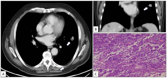 Axial (A) and coronal (B) CT scan images of a nodule (arrow) in the left upper lobe corresponding to a histologically confirmed pulmonary adenocarcinoma (C) (hematoxylin-eosin, original magnification, ×100).