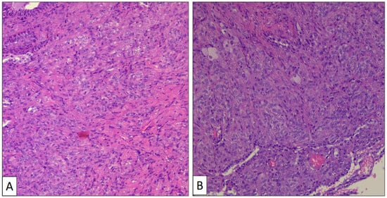These single cases support the idea that a subset of PSPs develop an aggressive potential linked to stromal malignant transformation. Wang et al. [52] have found AKT1 E17K somatic mutation and TP53 C176Y germline mutation in a PSP with aggressive behavior. Clinical aggressiveness includes not only lymph node [4,5], bone [17], or liver [51] metastases, but also pleural invasion [22,53]. Despite tumor dissemination, deaths directly caused by this tumor are extremely rare. In fact, only a single case of fatal onset has been reported in the literature so far [54].