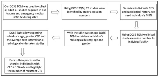 The data mentioned above were generated using our institute’s electronic radiation dose monitoring and archiving system, DOSE TQM (Qaelum NV, Belgium) [18]. The DOSE TQM system is linked with our regional healthcare sector’s existing radiology picture archiving and communication system (PACS). DOSE TQM supports different data exporting formats. However, the exported data are identified by study (e.g., study accession number, study identifier (ID) or study unique identifier (UID)), not by individual name or individual medical registration number (MRN). This is in place to maintain individual privacy. Furthermore, neither DOSE TQM nor PACS supports automated retrieval of CED. Hence, study accession numbers were used to identify individual MRNs. Once all the CT studies were linked with individual MRN, DOSE TQM was used to retrieve individual radiological history. This allowed us to access and analyze individuals’ CED and the average day’s interval for all the radiological studies undertaken by each individual. All data exported from DOSE TQM were in Excel format. Patient medical history information was retrieved from our radiology information system. Figure 1 demonstrates the steps undertaken to short-list adult individuals with CED ≥ 100 mSv. Initially, data retrieval was based on the CT studies performed at our dedicated trauma and emergency medical institute. However, retrieving individual radiological history demanded the inclusion of all radiological services performed at any medical institute within our healthcare sector.