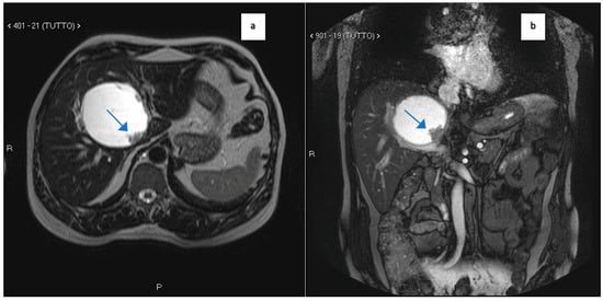 (a,b): MRI T2 axial (a) and coronal (b) images showing a large cystic mass involving the IV hepatic segment. An irregular-shaped mass is present on the posterior boundary of the cyst (arrows). The portal vein appears dislocated downward by the cyst.