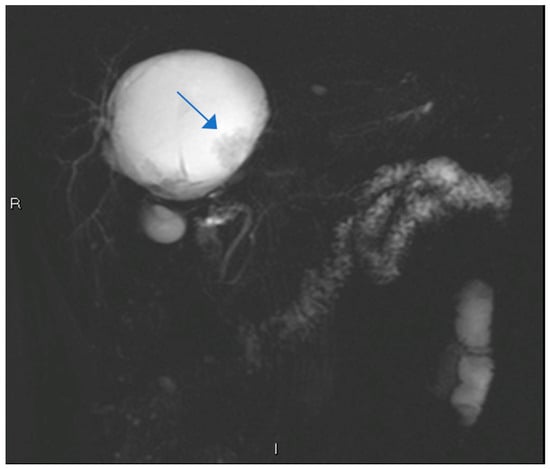 A 60-year-old Caucasian male was referred to our Hepatobiliary Unit in 2013 following the incidental discovery of an 8 × 8 × 9 cm round-shaped hepatic cyst located in segments S-IV, S-VII, and S-VIII. MRI revealed the cyst’s characteristics, including thin regular walls, internal septa, papillary projections, and enhancing solid components (Figure 1). Magnetic resonance cholangiopancreatography (MRCP) revealed a mass that displaced the biliary ducts, suggesting a potential compressive effect rather than direct invasion (Figure 2). This spatial relationship indicated that, while the mass was located near the biliary tree, further histopathological correlation was required to determine the nature of their interaction. The observed displacement pointed to extrinsic compression of the biliary tree, consistent with the effects seen in adjacent vascular structures, such as the portal vein in Figure 1.