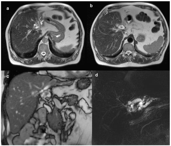 MRI T2 axial (a,b), T2 coronal (c), and MR cholangiography (d) images showing a multicystic lobulated mass with internal septations involving the hepatic hilum and causing dilation of the intrahepatic biliary ducts.