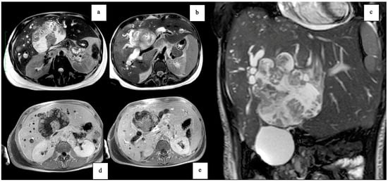 (a–c): MR images with T2 sequence in axial and coronal planes revealing a 10 cm diameter solid cystic lesion with vegetations along its walls. The images illustrate marked dilation of the intrahepatic bile ducts associated with the lesion. Additionally, diffuse signal alteration and centimetric nodules within the surrounding hepatic parenchyma suggest widespread disease localization; (d,e): axial T1-weighted images, post-intravenous administration of paramagnetic contrast agent, showcasing enhancement of the solid components of the lesion, internal vegetations, and the surrounding parenchyma infiltrated by the disease.