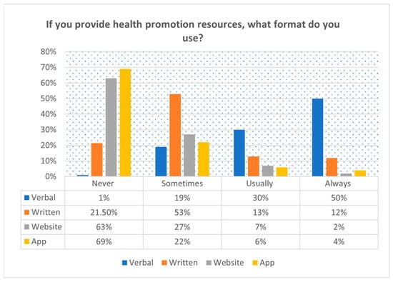 The majority of respondents were aware of public and clinical guidelines for physical activity (76%, n = 130), exercise (73%, n = 124), and weight management (71%, n = 121), compared to sleep at 53% (n = 91) (see Figure 1). Most PTs deliver HP advice verbally (80%), with apps (69%, n = 118) and websites (63%, n = 109) never used (Figure 2).