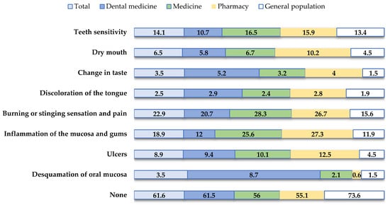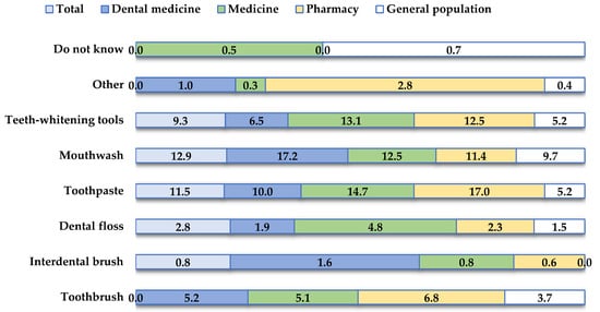 Figure 2 shows the oral hygiene products that participants reported to be associated with possible damage to the oral mucosa. Respondents indicated that they had experienced damage to the oral mucosa when using mouthwash (N = 146, 12.9%) and toothpaste (N = 130, 11.5%).
