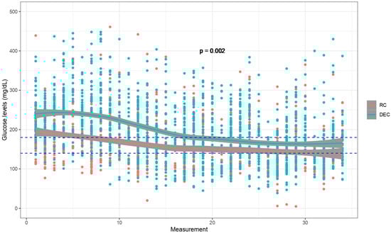 The differences in BG between participants who received DEC and those who received RC were investigated. A mixed model analysis was employed. This method was selected due to the substantial between-group baseline differences in glycemic indices, such as fasting blood glucose, hemoglobin A1c and diabetes complications. This statistical approach analyzes repeated BG measurements (five per day over eight days) and accounts for individual variations in BG patterns (random effect). The analysis allows for isolation of the specific effect of DEC on the BG trajectory. Due to the limited sample size, further confounder adjustments were not feasible. A scatter plot was produced with the serum glucose consecutive measurement number and test values in axes x and y, respectively. Plots were produced using ggplot2 [24] in R statistical software version 4.4.0 (R Core Team (2021)). The loess method was used for a smooth regression line with a 95% confidence interval. Secondary endpoints were analyzed using appropriate statistical tests, as mentioned above.