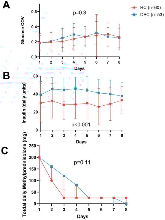 Although the DEC group received higher doses of glucocorticoids on three out of eight days (Table 4, p < 0.05) and a higher mean total daily insulin dose (42.8 ± 9 units vs. 27.6 ± 14.9 units, p < 0.001, Figure 2), the glucose coefficient of variation (COV) and BG time in range (TIR) were similar between groups, (p > 0.05; Figure 2 and Table 2 and Table 5). Additionally, the DEC group also had significantly higher rates of insulin response to hyperglycemia, i.e., administration of short-acting insulin when BG ≥ 200 mg/dL (66.4% vs. 46.3%, p < 0.001) (Table 2) with a comparable insulin sliding scale between groups.