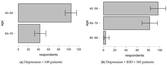 The demographic and diagnostic characteristics analyzed in patients with depression in comparison with patients with depression and IHD reveal several notable associations. The age distribution is significantly different between the depression-alone and depression-with-IHD groups. Depression is significantly more common in the 40–59 age group compared to the 60–79 age group, suggesting that depression is more common in the middle-aged population. This finding aligns with previous research indicating that the onset of depression is often linked to midlife stressors, including career pressures and family responsibilities []. In contrast, the proportion of patients diagnosed with both depression and IHD is more balanced in the 40–59 and 60–79 age groups, with no significant differences in either age group. The absence of patients in the 80–89 age group within the depression-only cohort suggests that the combination of depression and IHD is more likely to affect the elderly population, which is consistent with the literature suggesting that comorbidities are more common in older adults [].