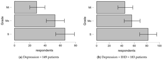 When depressive symptoms were analyzed, patients with both depression and IHD exhibited higher rates of severe depressive symptoms, including low mood, low energy, and anhedonia, compared to patients with depression alone. This trend emphasizes that IHD exacerbates the severity of depressive symptoms, indicating a need for simultaneous treatment of both disorders [].