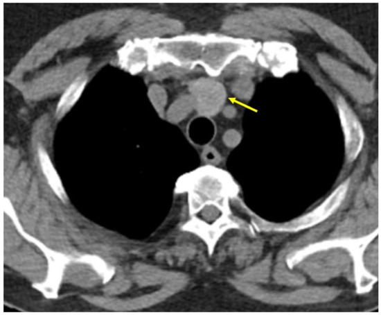 - Pilavaki, M.; Kostopoulos, G.; Asimaki, A.; Papachristodoulou, A.; Papaemanouil, S.; Palladas, P. Imaging of Ectopic Intrathoracic Multinodular Goiter with Pathologic Correlation: A Case Report. In Cases Journal; Springer: Berlin/Heidelberg, Germany, 2009; Volume 2, p. 8554. [Google Scholar] [CrossRef]