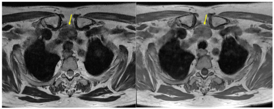 ETTM aspects (yellow arrow): MRI with IV contrast showing a nodule of 2.1 by 2.6 by 3 cm in the pre-vascular compartment of the upper mediastinum on the median line (pre-tracheal): (left) T2 moderate hypo-intensity and (right) T1 iso-intensity.
