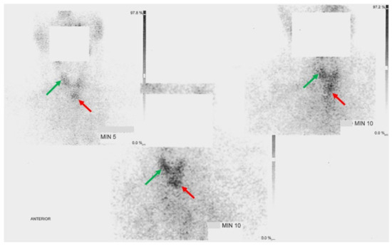 99m-Tc pertechnetate (148 MBq; effective dose 1.924 mSv) thyroid scintigraphy: an area of increased uptake in the upper part of the right thyroid lobe (orthotropic multinodular gland = green arrows) and an area of hyper-functional retrosternal thyroid tissue with hot nodules (ETTM = red arrows).