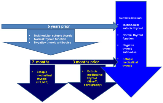We introduced an exceptional case of ETTM who presented unexplained dyspneea for several months that required imaging investigations; hence, a mediastinal mass was detected. The lady had a prior endocrine (thyroid) evaluation a few years before, but the index of ETTM detection was irrelevant, which is why we can hardly appreciate the rate of ectopic tissue growth under these specific circumstances. Generally, ETTM may remain asymptomatic for years unless congenital hypothyroidism or compressive complaints are detected [15]. Additionally, she experienced an increase in the multinodular goiter that might also cause intermittent breathing disturbances; thus, a synchronous removal of both thyroid tissues was taken into consideration with a post-operative good outcome and release of breathing complaints, noting the minimally invasive modern procedure [16].