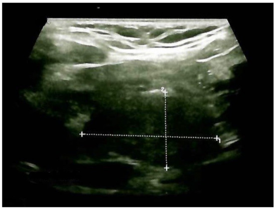 Thyroid ultrasound confirmed previous aspects in terms of gland enlargement and a multinodular goiter with a small increase in the largest nodule diameter. The right lobe was 2 by 2 by 4.3 cm, and the left lobe was 1.8 by 1.9 by 3.8 cm, with a hypoechoic, intensely inhomogeneous pattern; the lower half of the right thyroid lobe had a nodular conglomerate of 3.1 by 1.6 by 1.7 cm. Inferior to the right thyroid lobe, a hypoechoic mass with a structure similar to that of the thyroid of 3.66 by 2 by 2.6 cm was observed (ETTM). She had no neck lymph node involvement (Figure 5).