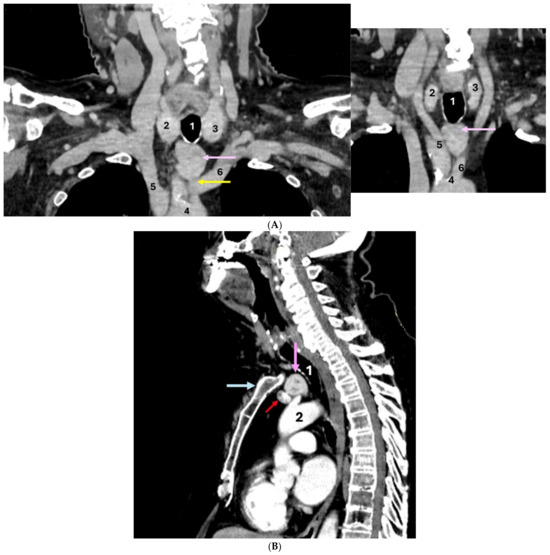 Contrast-enhanced CT scan showed: (A) Coronal plane (two different sections): 1—trachea; 2—right thyroid lobe; 3—left thyroid lobe; 4—ascending aorta; 5—brachiocephalic trunk; 6—left common carotid artery; ectopic thyroid (pink arrow); arterial supply (yellow arrow) for the ectopic thyroid, originating from the left common carotid artery. (B) Sagittal plane: 1—trachea; 2—ascending aorta; venous supply (red arrow) for ectopic thyroid, originating from the left brachiocephalic venous trunk; ectopic thyroid (pink arrow); manubrium (blue arrow).
